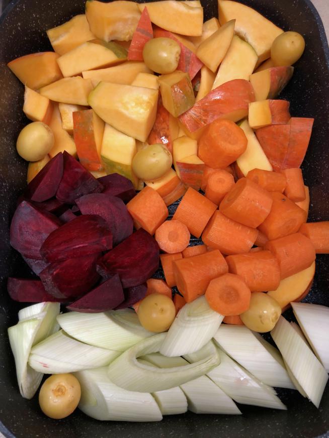2-3 ק"ג ירקות מתאימים לאפייה שאוהבים (ראו הקדמה). אני שמתי ירקות באווירת ראש השנה: