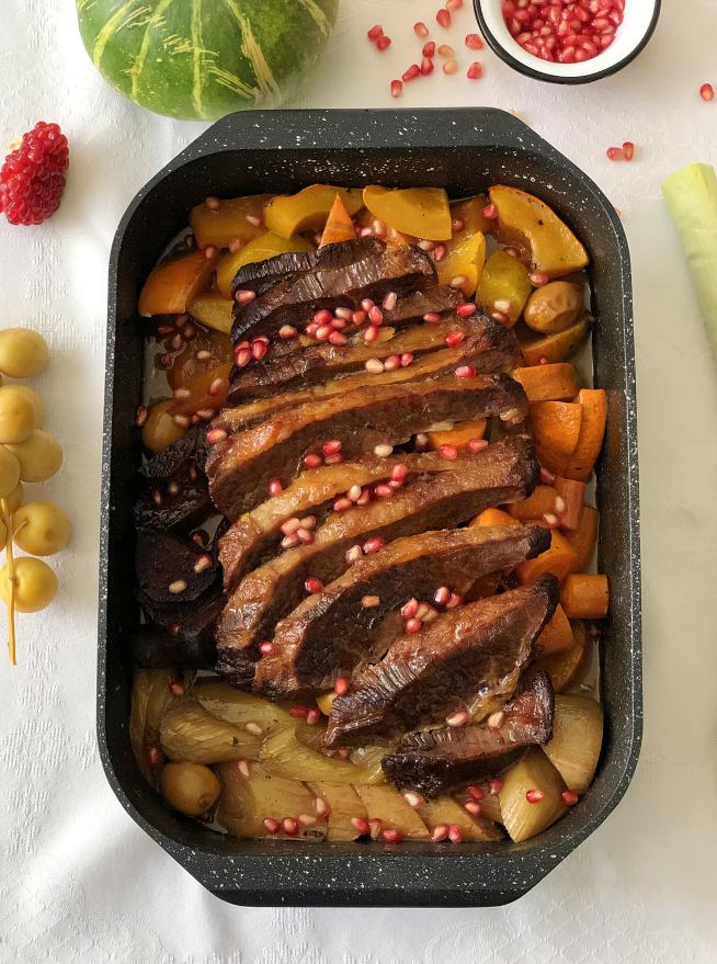 כל שנה לקראת החג אני שואף לפרסם לפחות מנה אחת שתעשה שימוש מקסימלי בברכות של ראש השנה, והפעם הצלחתי לשים שש באותו מגש – של חזה בקר בתנור עם ירקות, מנה נהדרת חגיגית וצבעונית שמכינים בקלי קלות ?