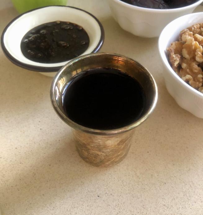 אחר כך תמרים אולי קצת יותר שיהיה מתוק. תפוח אחד רימון אחד וכוס יין מתוק.
