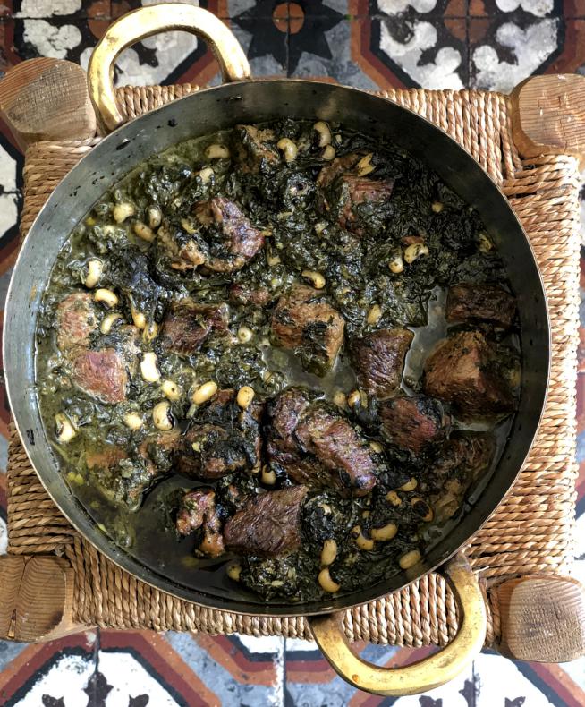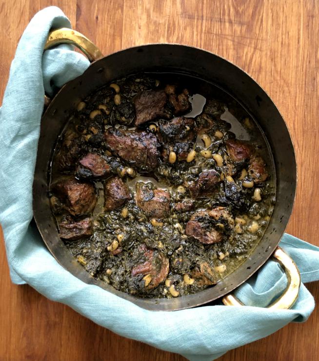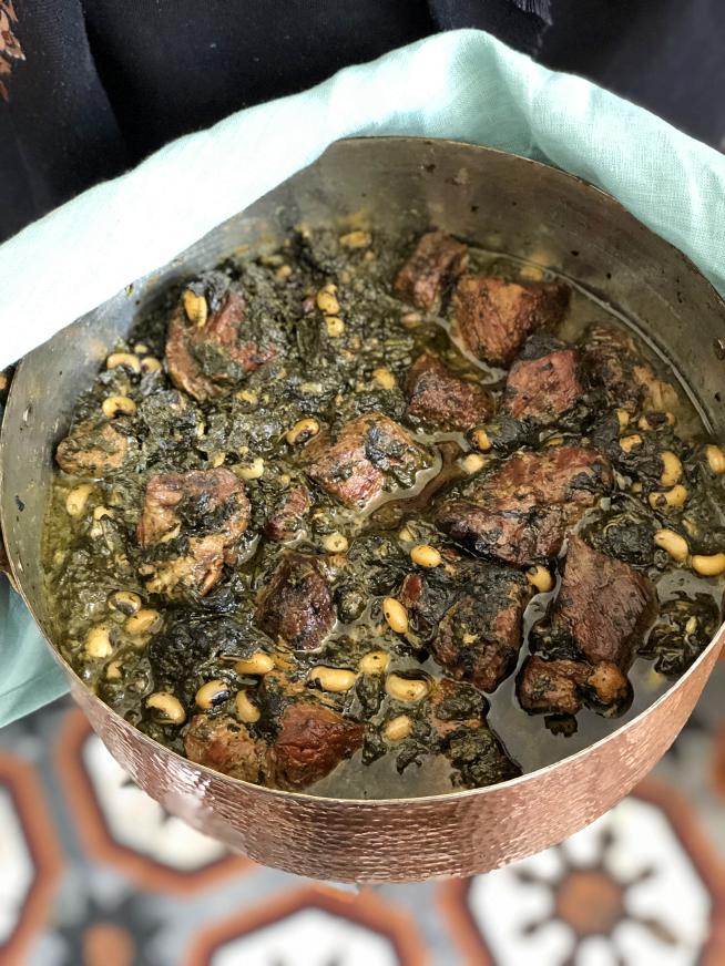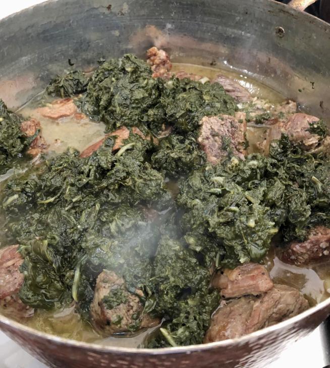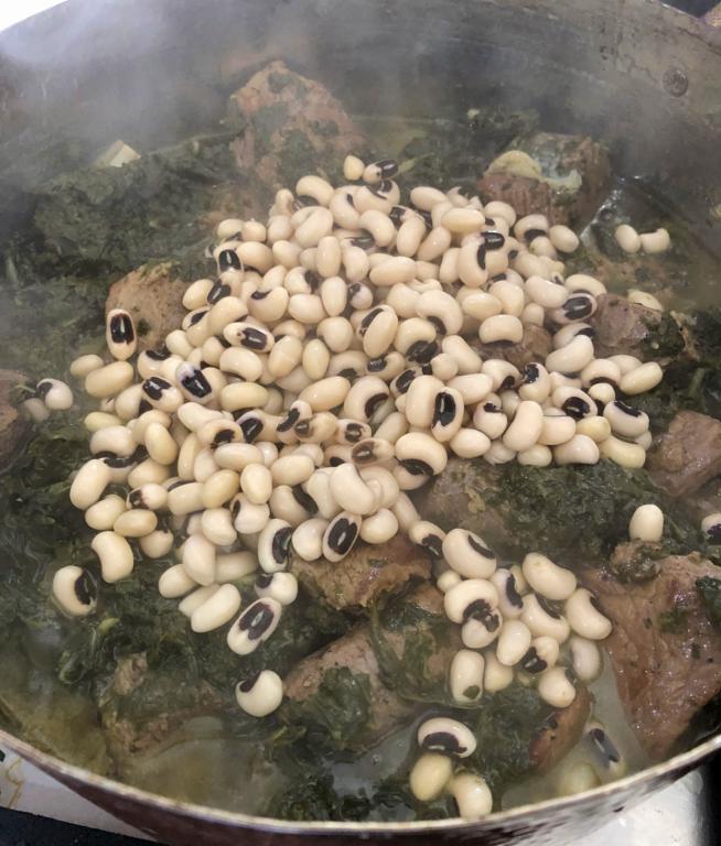 כשתמצית הפקיילה מוכנה, חן אוהבת לטחון אותה קצת עם בלנדר ידני, לא לקבלת ממרח אלא כדי לפרק טיפה את הסיבים ככה שהכל יתאחד מהר יותר. לסיר עם הבשר נכנסות שיני שום משלושה ראשי שום ישראלי טרי של העונה, תמצית העלים ולבסוף לוביה מושרית (קטנית לא מוערכת מספיק לדעתי בארץ).