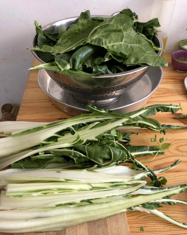 כמו שתי מאמות מבוגרות, את הדקות הראשונות במפגש שלנו הקדשנו אני וחן להפרדת עלי מנגולד מהגבעולים – פשוט חותכים עם סכין איפה שהגבעול הלבן מסתיים והעלה הירוק מתחיל.
