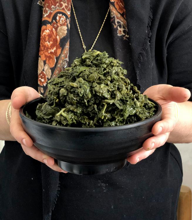 חן מכינה את התבשיל שלה על בסיס עלי מנגולד – היא מפרידה את העלים הירוקים מהגבעולים הלבנים העבים ומשתמשת רק בירוק. היא מספרת שאפשר להשתמש בתרד תורכי, הוא פשוט עולה פי 2 מאשר עלי מנגולד, וכשמכינים כמויות גדולות, כמו בבית קורן, פער המחירים הזה משמעותי.