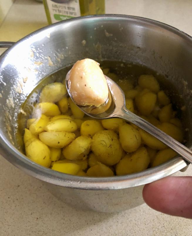 רק שאלה – לא כל שיני השום שווים בגודלם, ובזמן ההכנה ראיתי שהשיניים הגדולות יותר עדיין היו קשות בעוד שהקטנות התרככו מהר והחלו להשחים. נאצלתי לשלות אותם אחד אחד לפי דרגת ההכנה.