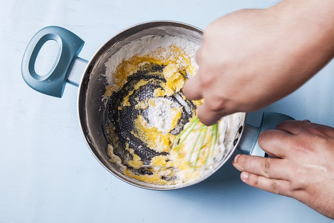 - מוסיפים את החלב וטורפים היטב לקבלת תערובת חלקה.