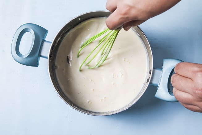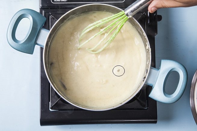 - ממקמים את הסיר מעל להבה בינונית ומביאים לרתיחה תוך כדי בחישה מתמדת, עד שהקרם מבעבע והסמיך.