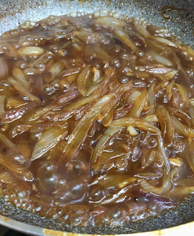 את הבצלים אני פורס דק ומטגן עם שמן זית, ואז מרכך אותם בסיר עם מים או עם נוזלי האסאדו. כשהבצלים רכים אני נותן להם טעמים: