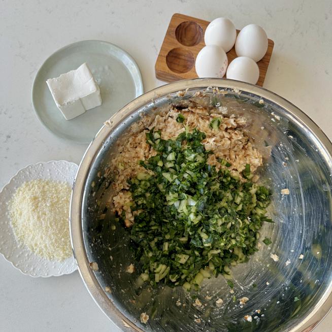 • מוסיפים את הביצים, מפוררים פנימה את הגבינה הבולגרית (או פטה), הפרמזן ומתבלים במלח ופלפל לפי הטעם.