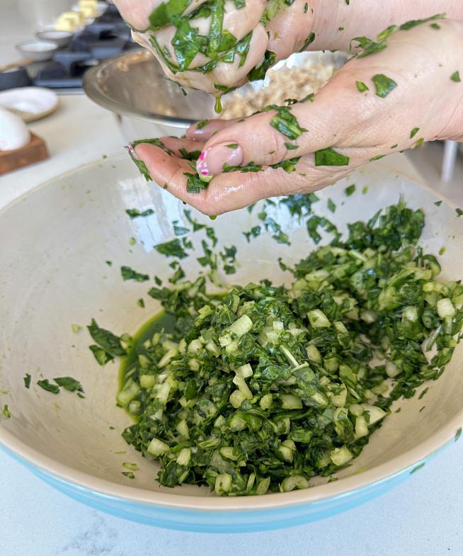 • סוחטים היטב גם את המנגולד ומעבירים לקערה עם המצות הסחוטות.