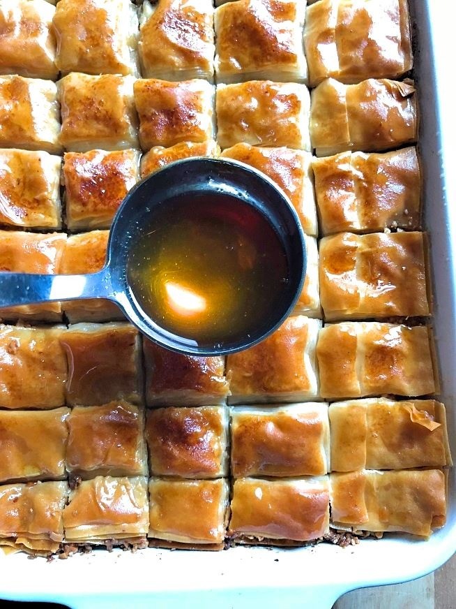 את הסירופ יוצקים על הבקלאווה לאחר שיצאה מהתנור, וחשוב לוודא שהוא מגיע לכל פינה. אחרי העבודה הלא כל כך קשה מגיע החלק הקשה באמת: ההמתנה. הבקלאווה צריכה לנוח לפחות שעתיים כדי לשתות ולספוג את כל הנוזלים, עד שהיא נהיית עסיסית ומתוקה.