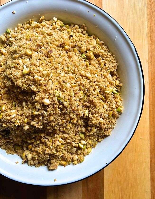 דבר ראשון שצריך לעשות זה להכין את תערובת המילוי, שמורכבת בסך הכל מאגוזי מלך, שקדים ופיסטוקים. אתם יכולים להשתמש בשניים מהם, בשלושה או רק באחד (למשל אם ראיתם מבצע על אגוזי מלך).