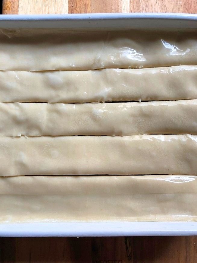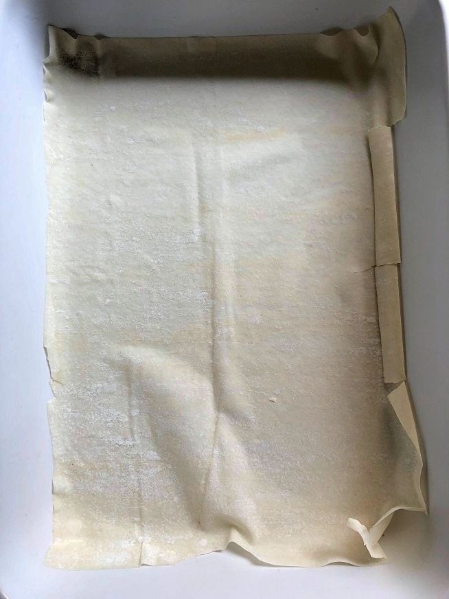 • מניחים דף אחד בתחתית התבנית ומברישים אותו בחמאה/שמן קוקוס. באותו אופן מניחים מעליו עוד 9 דפים אותם גם מברישים.