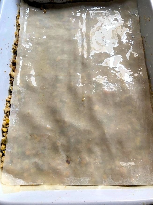 • מעל האגוזים מניחים עוד 6 עלי פילו חתוכים, ושוב מברישים בין דף לדף.