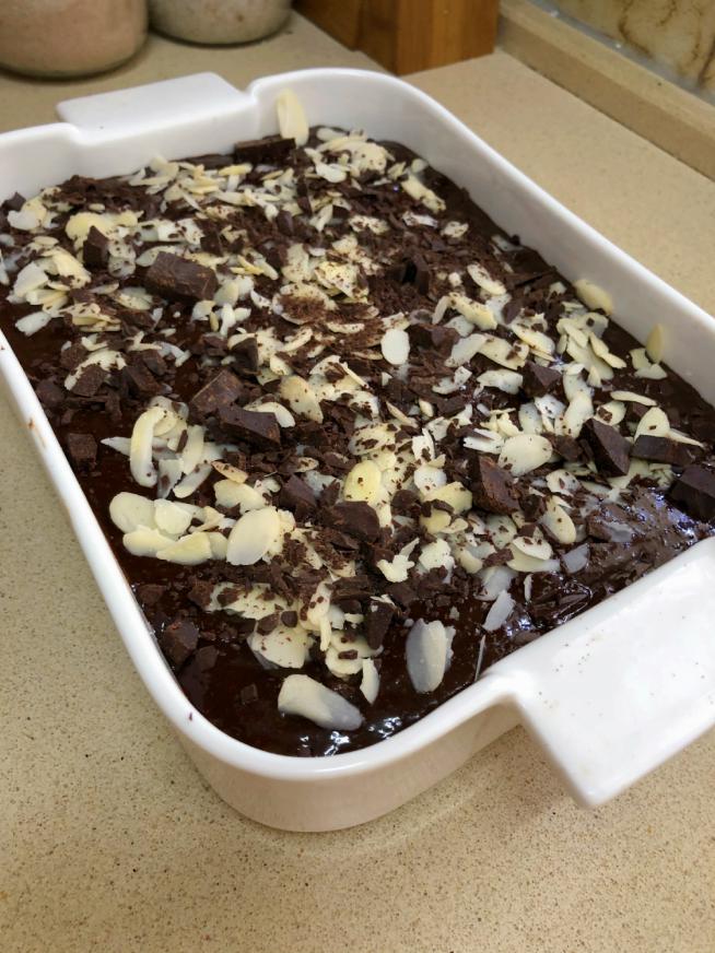 ברגע שכל המצרכים מעורבבים יחד אני מוסיף עוד שוקולד קצוץ או שוקולד צ'יפס לתערובת, כי אני יכול, ומכאן עוברים לתבנית לפיזור של תוספת (כאמור, בחרתי בשקדים פרוסים) והיידה לאפייה.