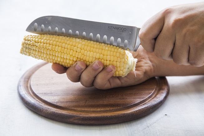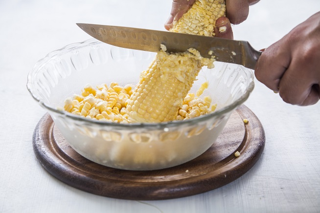 - לוקחים 2 קלחי תירס ו'מגלחים' אותם: מחזיקים אותם מאוזן מעל קרש חיתוך ובעזרת סכין חותכים את הגרגרים מהקלח.
