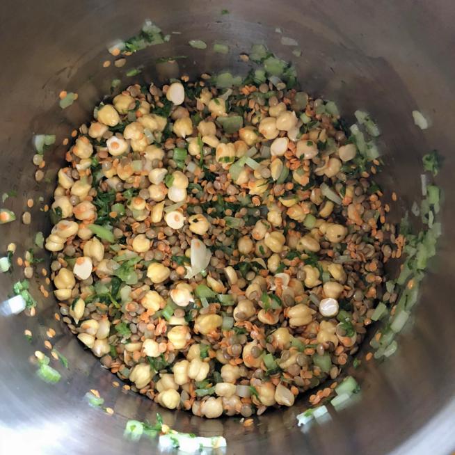 מתחילים בטיגון של ירקות קצוצים: נופר שמה המון סלרי ושום, ואחרי ריכוך כל במחבת הוספנו את החומוסים, עדשים, עגבניות מגוררות, וקצת תבלינים (כמון וכורכום).
