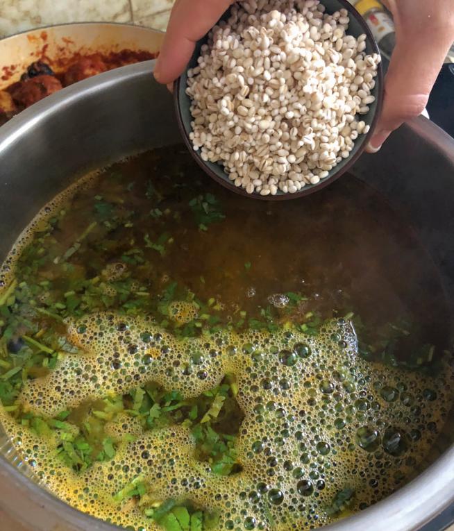 אחרי שכל הירקות וגרגרי החומוס מתרככים מוסיפים למרק גריסי פנינה – נופר מוסיפה אותם בשלב זה ולא בהתחלה כי היא רוצה שישמרו על המרקם שלהם, ואחרי 5 דקות מצטרפות גם האטריות הקלויות.