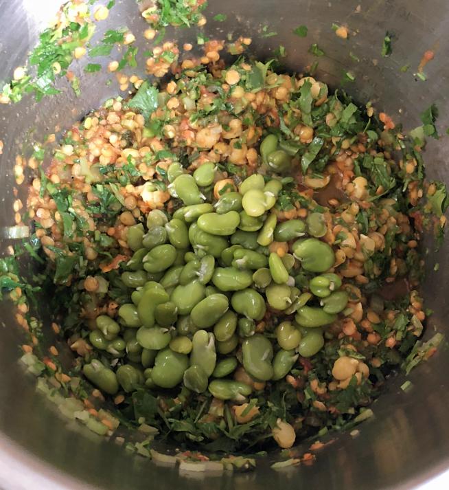 - מוסיפים את החומוס, העדשים, הפול, בערך 2/3 מעשבי התיבול הקצוצים (כוסברה+פטרוזיליה) והעגבניות המגוררות.
