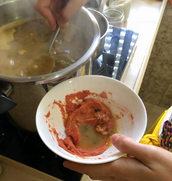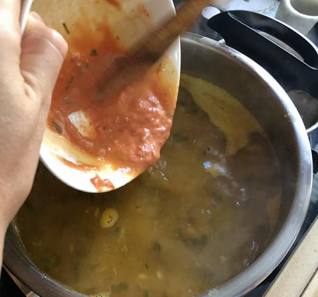 התוספת הלפני אחרונה למרק היא רסק עגבניות מעורבב עם קמח. מערבבים את שניהם למשחה סמיכה (בשפה המקצועית זה נקרא רביכה), ואת המשחה הזו מדללים עם 2 מצקות מהמרק – מוסיפים אותן אחת אחת, בין הוספה להוספה מערבבים כדי לקבל תערובת חלקה, אותה שופכים חזרה למרק.