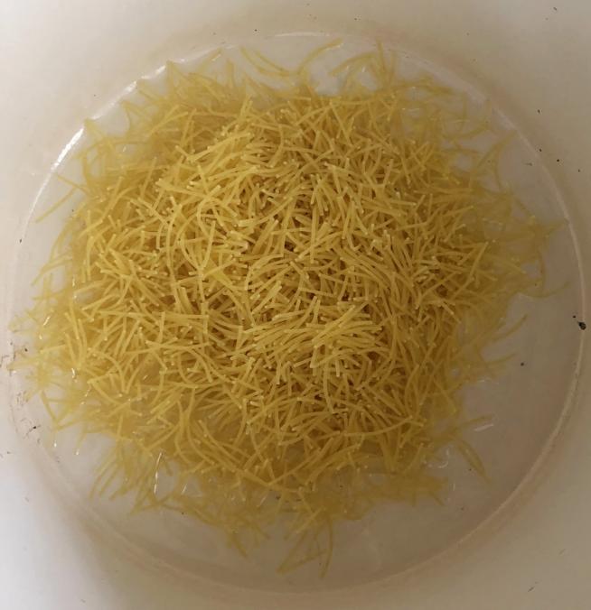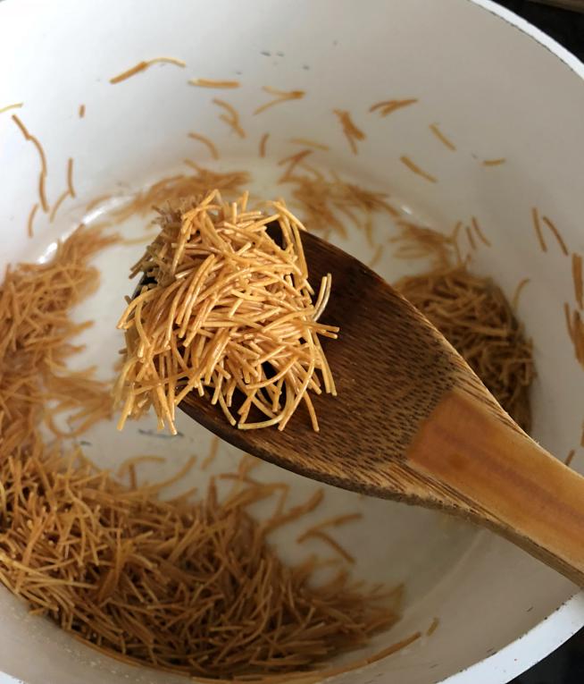 - קולים מעל להבה בינונית גבוהה אגב ערבוב מתמיד, 2-4 דקות או עד שהאטריות זהובות ויפות. שומרים בצד.