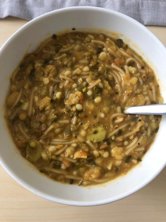 אני תוהה איך לשפר אותו- בא לי לטחון קצת או לבשל עוד המון – אבל האטריות והגריסים כבר שם זה בטח יצא עיסה כזאת.