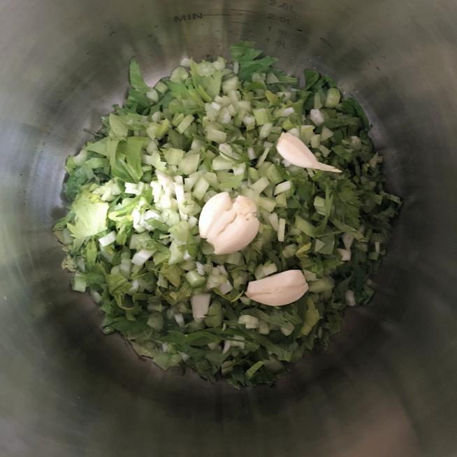 - קוצצים היטב את גבעולי הסלרי ואת הכוסברה והפטרוזיליה (עם הגבעולים). את שיני השום פורסים ומקלפים את הפול הירוק המופשר (צובטים את הפול ואז הוא משתחרר מהקליפה בקלות).