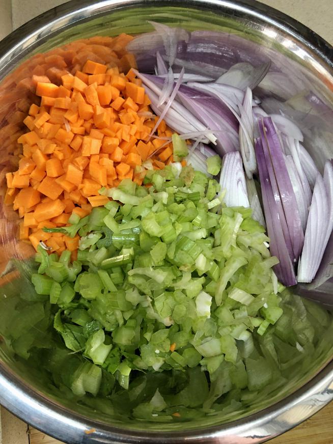 - חותכים את הסלרי והגזר לקוביות בגודל בינוני/קטן. את עלי הסלרי קוצצים דק.