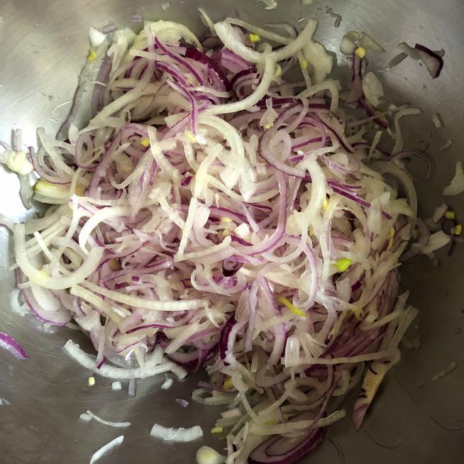 - חוצים את הבצלים לאורך, פורסים אותם דק ומעבירים לקערה. מוסיפים את המלח ומערבבים היטב. מועכים מעט את הבצלים עם הידיים כדי שהמלח יעטוף אותם מכל הכיוונים.