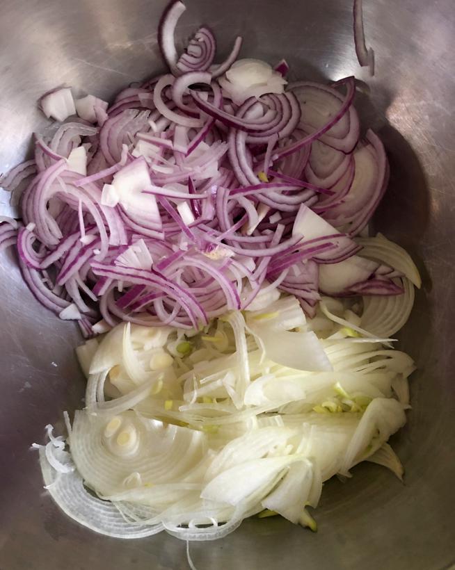 בדרך כלל במסעדות ובדוכנים שמים רק בצל לבן, אני שם בצל סגול גם כי אני אוהב את הצבע שהוא מוסיף. בתמונות כאן הכנתי כמות כפולה מזו שרשומה במתכון.