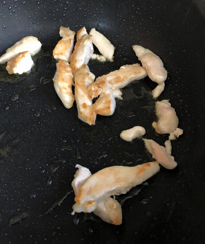 ראשון נכנס החלבון הנבחר וכשהוא מזהיב טיפה אפשר לשים אותו בצד – כאן בחרנו ללכת כאמור על חזה עוף, ובמסעדה שף יניר משרה את רצועות העוף למשך הלילה בחלב קוקוס כדי לרכך אותן. מוזמנים גם – המהלך מוסיף שכבת טעם מעניינת למנה.