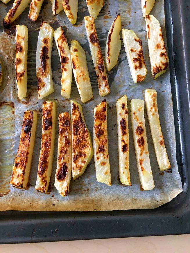 אני מעדיף לחתוך את הצ'יפסים עבה יחסית, כי במהלך האפייה הירק יאבד לחות ויתכווץ, ואני רוצה שישאר לי מהמרקם שלו, והוא לא רק ישתזף.