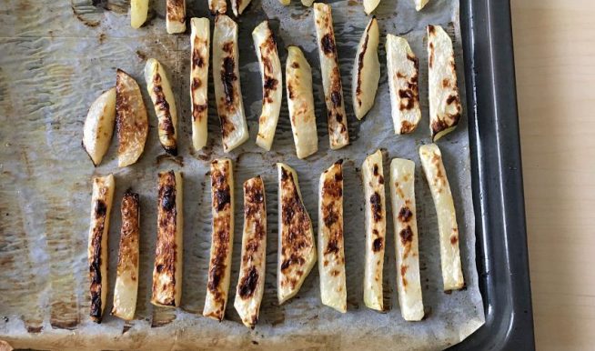 את הרעיון לחתוך אותה לצורת צ'יפס קיבלתי מכם, הקוראים והקוראות, וכשבדקתי את המתכון (שראיתי שרץ גם בקבוצות דיאטה כמו חלי ממן) הופתעתי ממש מהקלות מצד אחד ומהטעם המיוחד מצד שני. אז אשמח אם תנסו ותספרו לי איך יצא.