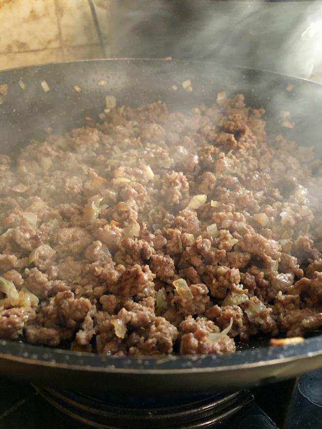 קודם כל מטגנים בצל – הוא יוסיף מתקתקות מצוינת ונהדרת למנה, כשהוא קצת שחום מוסיפים בשר ומתחילים למעוך אותו עם הכף.