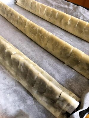בעזרת סכין מסמנים חריצים כל 2 סמ (בלי החריצים לא תצליחו לפרוס את המאפה לאוזניים יפות צילום עז תלם