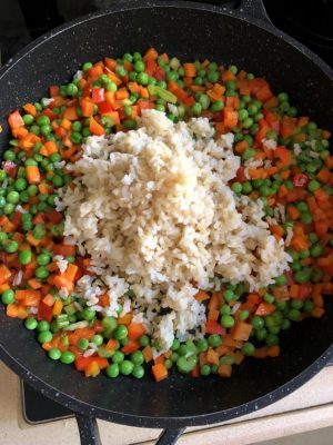 מטגנים את כל הירקות טיגון קל ואז מוסיפים את האורז המבושל. צילום עז תלם