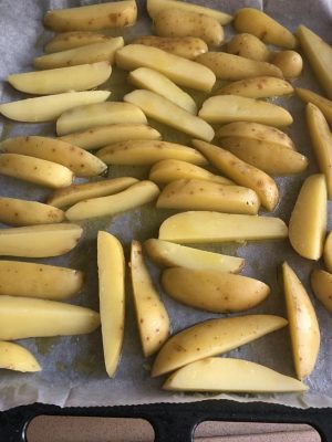 אחרי הסינון מסדרים את תפוחי האדמה על תבנית עם שמן זית בנדיבות ומתבלים במלח. צילום עז תלם