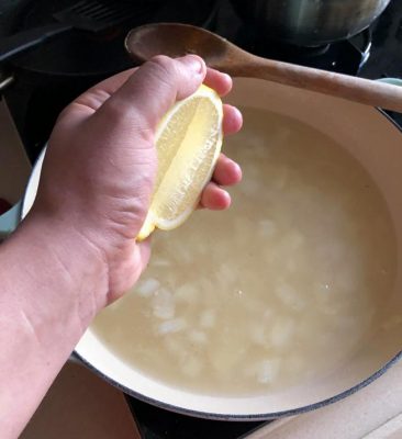 מוסיפים לבצל המטוגן והשום מים, מיץ לימון, טיפה כורכום וסוכר חום. צילום עז תלם