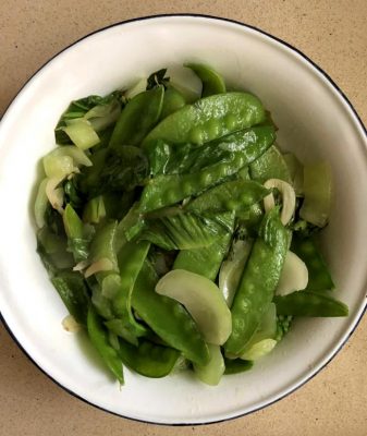 אפונה סינית ובאק צ'וי בשום ולימון. צילום עז תלם