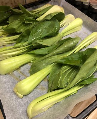חותכים את הבאק צ'וי לרבעים ומסדרים בתבנית. צילום עז תלם