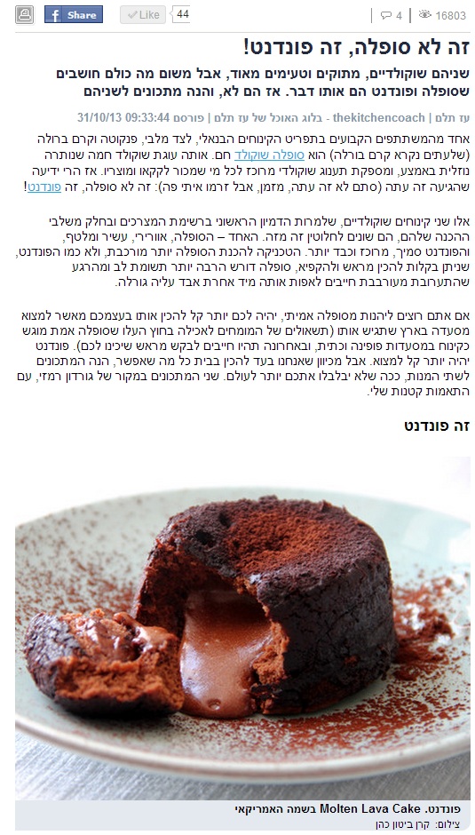 1.11.2013 – אתר 'אוכל טוב' של מאקו מפרסם את כתבת ה"זה לא סופלה זה פונדנט" שלי