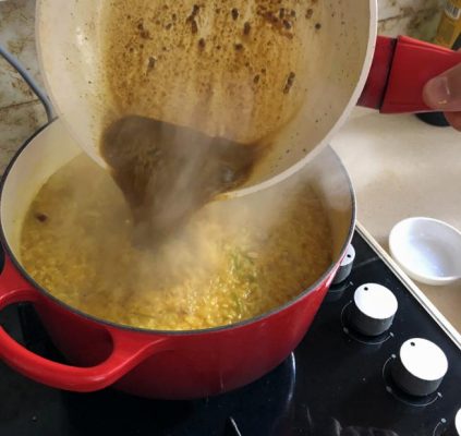 בזריזות מעבירים את מחבת התבלינים החמים לסיר המרק. צילום עז תלם