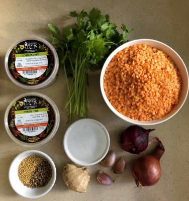 כל המצרכים לדאל עדשים (חוץ מכורכום אבל הוא יופיע במערכה הבאה). צילום עז תלם