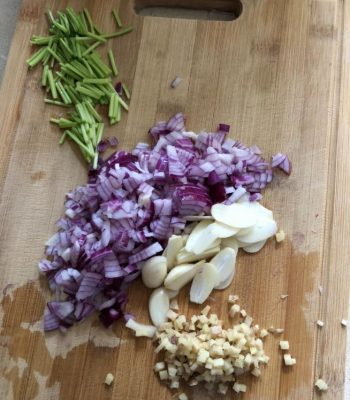 קוצצים את הבצל, הג'ינג'ר, השום והגבעולי הכוסברה. צילום עז תלם