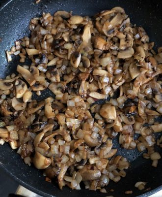 הבצל והפטריות מוכנים להצטרף לפירה. צילום עז תלם