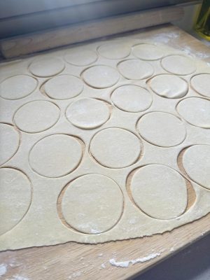 את הבצק שנשאר אוספים לכדור, מרדדים ויוצרים גם ממנו וריניקי. צילום עז תלם