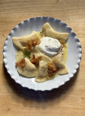 מגישים עם חמאה, בצל מטוגן, פלפל שחור, שמנת חמוצה ושמיר. צילום עז תלם