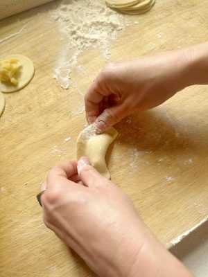סוגרים לצורת חצי עיגול ומהדקים היטב את הבצק סביב המילוי. צילום עז תלם