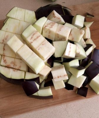 חותכים את החציל (כולל האף) לקוביות בגודל 3 סמ פלוס מינוס. צילום עז תלם