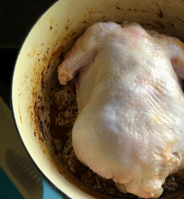 מניחים שליש מהאורז בתחתית ועליו שמים את העוף. צילום עז תלם