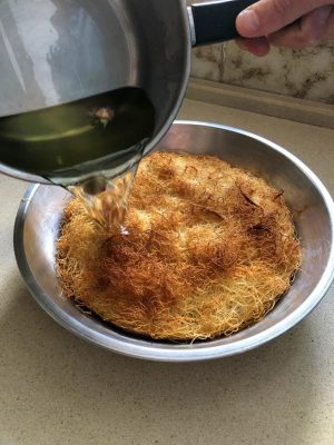 יוצקים את הסירופ מעל הכנאפה החמה. צילום עז תלם