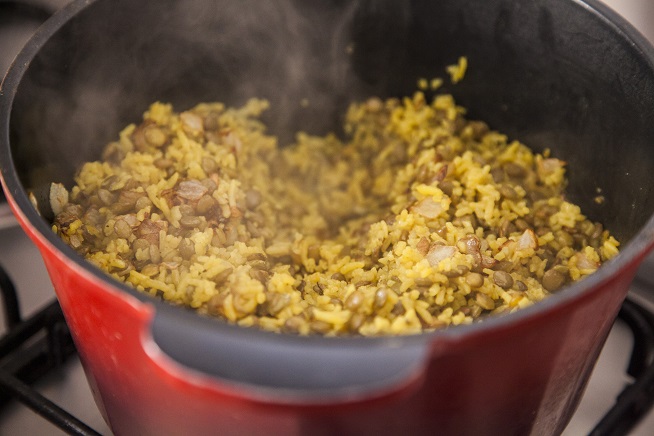 • מסננים את האורז והעדשים (יש המשתמשים במי ההשרייה לבישול – מוזמנים גם) ומעבירים לסיר.